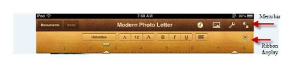 Tap the “X” on the upper right-most part of the screen and the ribbon display disappears for more screen real estate (tap the ruler just below the main menu and the ribbon reappears). The double arrows also allow users to toggle the menu display on/off. Word prompts appear to help with typing and you can even see the word count if desired (turn on from within “Settings”). Like Keynote, there are options for sharing and printing, find/search, document setup, and settings. As with most other apps, holding a document until it shakes provide options for deleting, duplicating, sharing or copying. One of the things you will appreciate in Pages is the ease with which you can make changes to the style of the document in terms of font, character attributes (bold, underline, etc.), text justification and headlines. You also can change the layout and insert various objects (photos, tables, charts, etc.) for graphic-rich reports or newsletters.