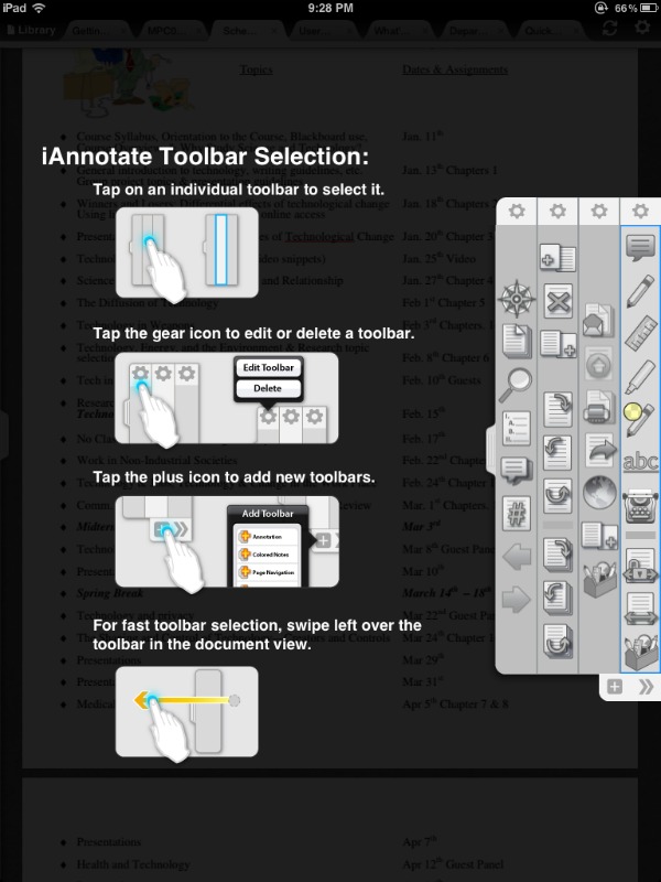 iAnnotate responds well to many of the gestures that you have come to appreciate when using the iPad. Tap and hold, single and double tap, swipe, and drag, just to list a few. iAnnotate is one well designed app and I think that you will find that it will handle just about anything you can throw at it!