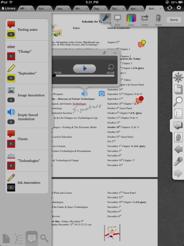 Indeed, there is little that you cannot accomplish in iAnnotate! Touch a blank area of a document and you are provided with a neat set of standard tools from note, pencil, signature, typewriter and other features. Touch a word and a different set of tools pop up that allows you to copy, highlight, strikeout, etc. One day, while experimenting I even came across an option that allowed me to make a brief recording. This added feature is a great option that provides audio notes to serve as a reminder. Uploading and/or synching iAnnotate documents with Dropbox or some other account is a cinch. Several of my colleagues use iAnnotate to evaluate students’ work which they then e-mail. I use the app to mark up articles or take notes on the agenda at departmental or other meetings. Features such as multiple undos, deleting all annotations made—the entire document or just those on a single page—and obtaining a summary of annotations really places iAnnotate high on my selected list of apps!